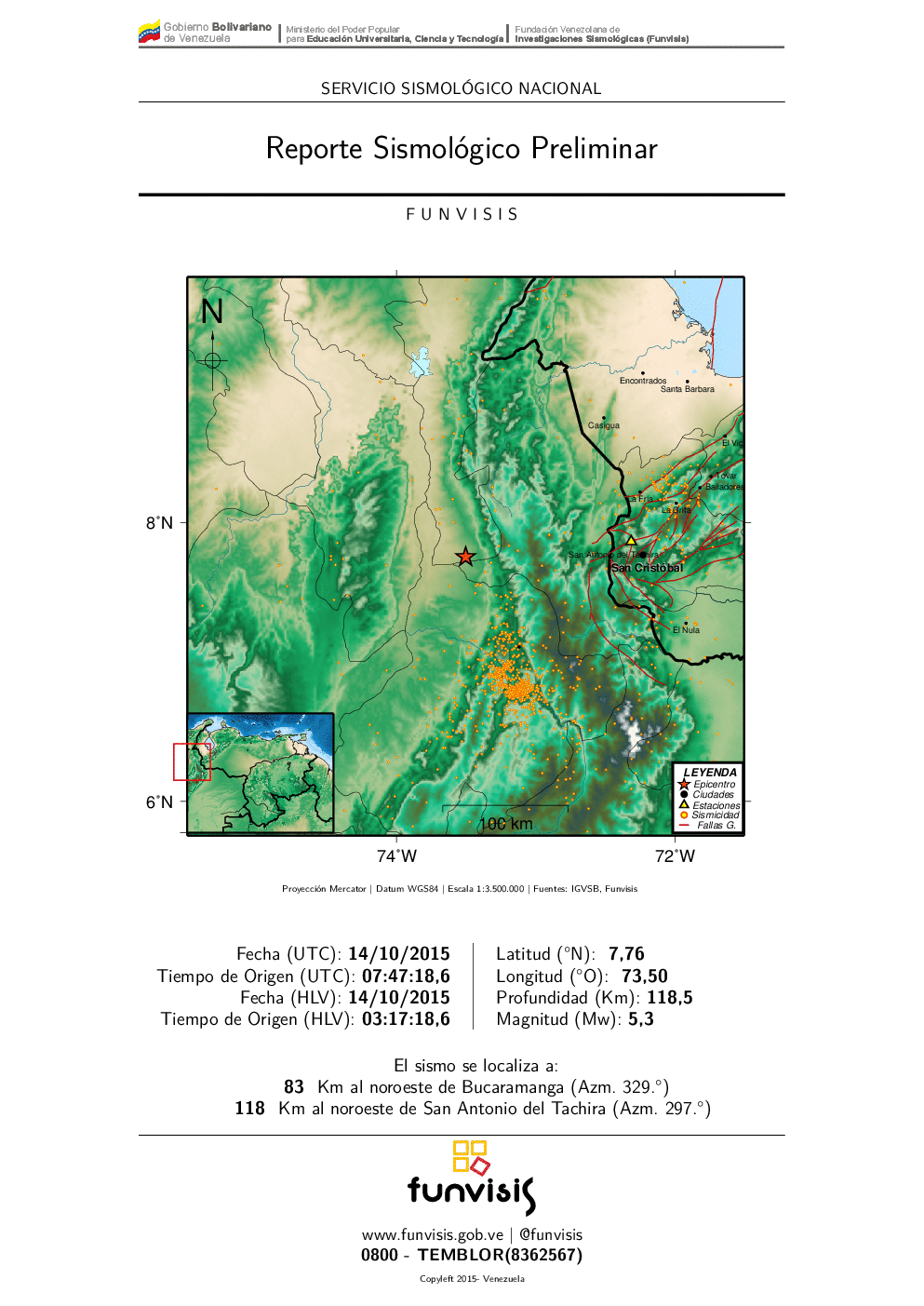 La Fundación Venezolana de Investigaciones Sismológicas (Funvisis), ente adscrito al Ministerio del Poder Popular para Educación Universitaria, Ciencia y Tecnología (Mppeuct), informa a la población que hoy 14 de octubre de 2015 a las 03:17 HLV hubo un sismo sentido en el estado Táchira y se registró en Bucaramanga, Colombia, de magnitud 5.3.
